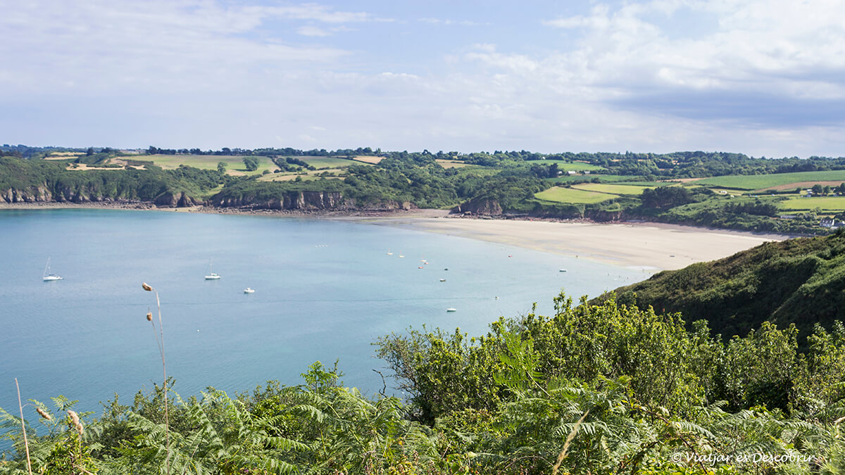 Después de visitar el centro de Paimpol, me pongo en marcha de nuevo. Me quedan unos 25 km hasta Plouha donde tengo previsto dormir. Este es el tramo más bonito del día. Avanzo por carreteras secundarias paralelas al litoral y las vistas son fantásticas. La escarpada costa bretona hace que el recorrido sea un constante de subidas y bajadas. Y aunque las subidas con la bicicleta cargada son duras, siempre me regalan panorámicas mágicas. Con el sol de la tarde el mar brilla de una manera especial. No dudo en detenerme cada pocos kilómetros para saborear las vistas.