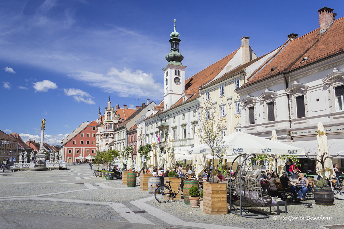 Continuamos paseando hasta la plaza principal de la ciudad: la Plaza Glavni. Allí se ubica el ayuntamiento y una columna votiva, un símbolo que recuerda la plaga de peste que afectó a la ciudad.