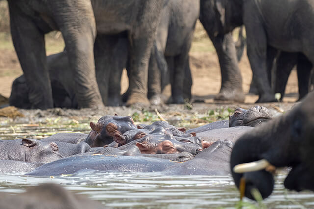 Al mediodía, en cambio, quedo maravillado por la ruta en barca por el Canal de Kazinga. Puedo ver muchísimos hipopótamos de cerca, y también un numeroso grupo de elefantes mientras se bañan y beben en el canal.